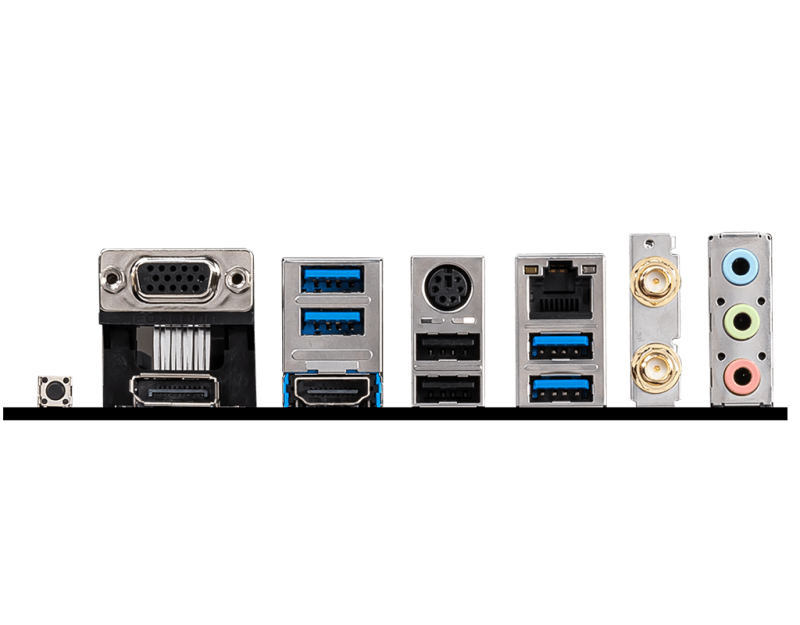 I/O:VGA; USB 3.2 Gen 1 5Gbps Type-A; Keyboard / Mouse; LAN; Flash BIOS Button; DisplayPort; HDMI; USB 2.0; USB 3.2 Gen 1 5Gbps Type-A; Wi-Fi Antenna connectors; 3x Audio jacks