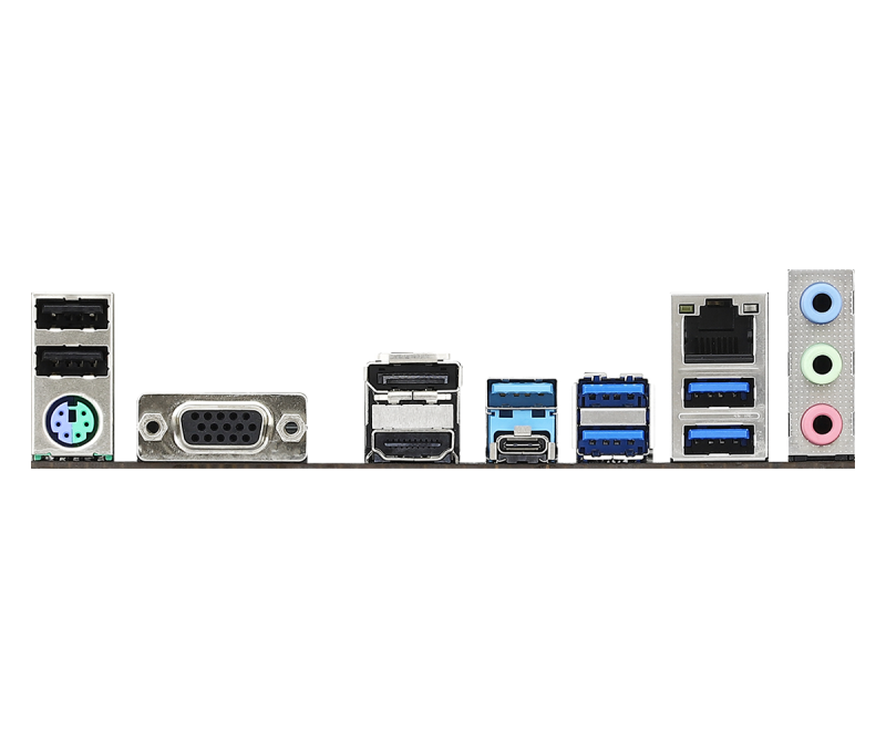 I/O:- 1 x PS/2 Mouse/Keyboard Port; - 1 x D-Sub Port; - 1 x HDMI Port; - 1 x DisplayPort 1.2; - 2 x USB 2.0 Ports (Supports ESD Protection); - 1 x USB 3.2 Gen2 Type-A Port (10 Gb/s) (Supports ESD Protection); - 1 x USB 3.2 Gen2 Type-C Port (10 Gb/s) (Suppo...