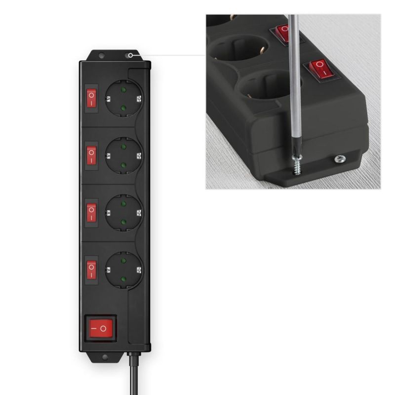 HAMA Разклонител с ключ, 4 гнезда на 90°, стенен монтаж, 1.4м, черен