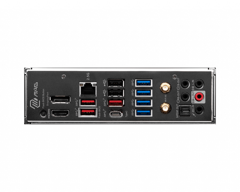 I/O:DisplayPort 1.4; 2.5G LAN Port; USB 2.0 Port; USB 3.2 Gen 1 5Gbps Type-A; Wi-Fi / Bluetooth Antenna; HD Audio Connectors; Flash BIOS Button; HDMI™ 2.1 Port; USB 3.2 Gen 2 10Gbps Type-A; USB 3.2 Gen 2x2 20Gbps Type-C; Optical S/PDIF OUT