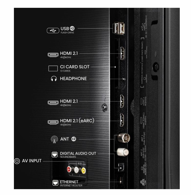 3 HDMI, 2 USB, S/PDIF out, CI+ Slot, 2 RF In, Audio (L/R) in