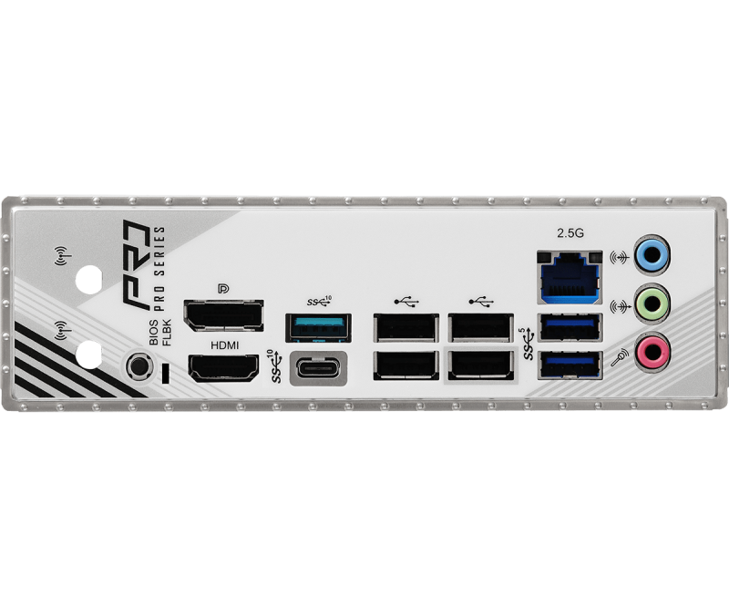 2 x Antenna Mounting Points;1 x HDMI Port;1 x DisplayPort 1.4;1 x USB 3.2 Gen2 Type-A Port (10 Gb/s);1 x USB 3.2 Gen2 Type-C Port;2 x USB 3.2 Gen1 Ports;4 x USB 2.0 Ports;1 x RJ-45 LAN Port;1 x BIOS Flashback Button;HD Audio Jacks: Line in / Front Spea...